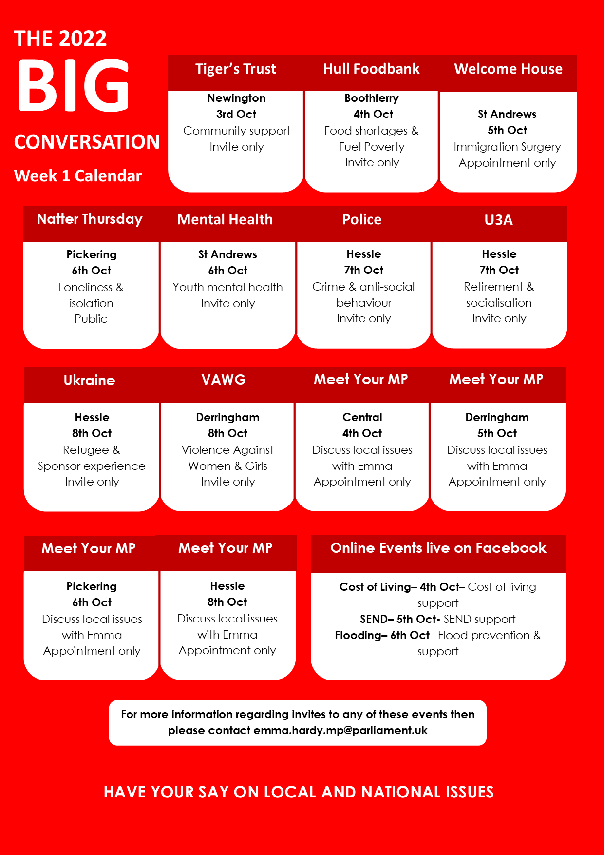 For more information on any of these events or how to get involved then please contact Emma by email, emma.hardy.mp@parliament.uk or by phone 01482 219211.